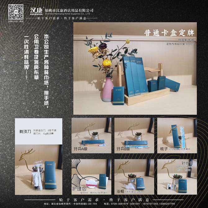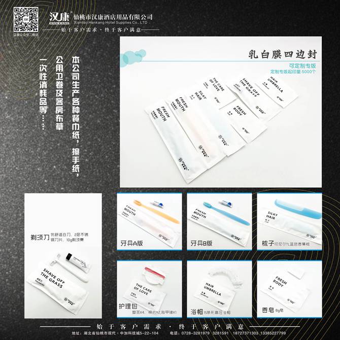 湖北汉康工贸有限公司是维达公司江汉平原(仙桃、天门、潜江、洪湖)特约经销商,长年提供各种高中档餐巾纸、方巾纸、钱包纸巾、盒装纸、擦手纸、卷筒纸、公用卫卷等纸品;筷套、桌布、口布、点菜单、酒水单等印刷单据;床单、被套、枕套、枕芯、云丝被、羽绒被、床垫、方巾、面巾、地巾、浴巾等客房布草;牙具、梳子、香皂、拖鞋、浴帽、洗发液、淋浴液、杂件、清洁用品等一次性客房用品。